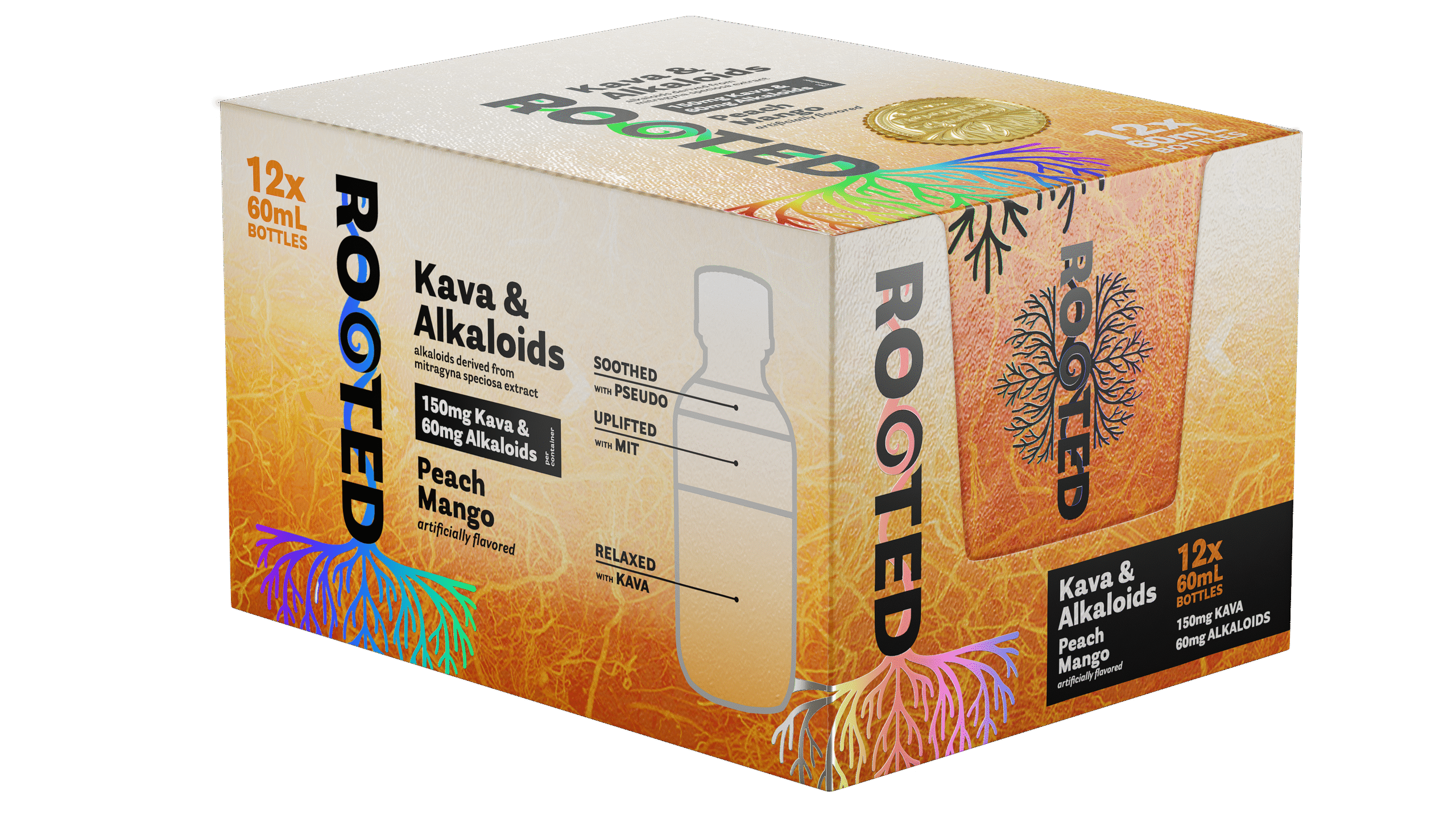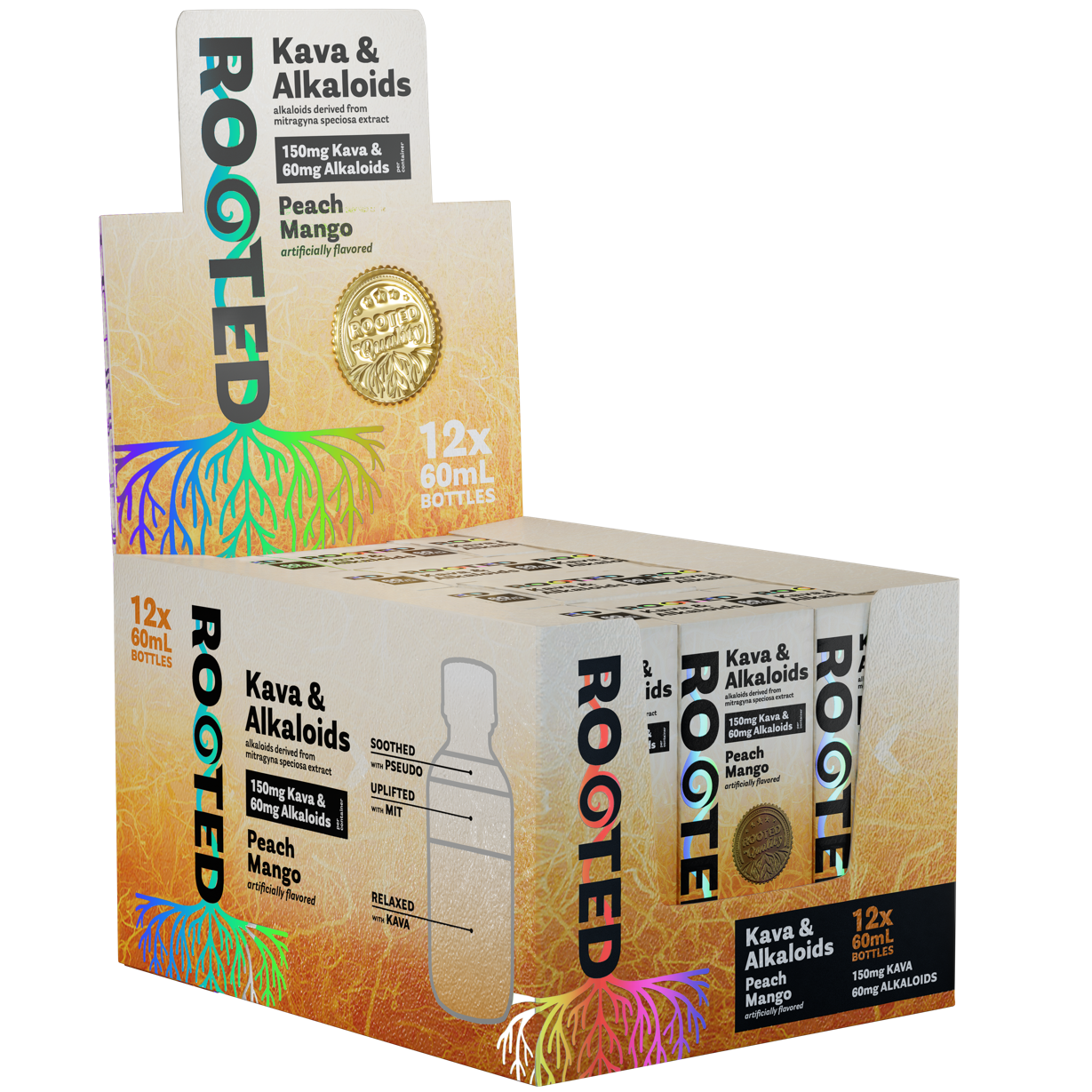 A tropical blend of kava and alkaloids designed for calm focus and mood balance. Each 12-bottle display of Rooted Peach Mango shots offers a delicious, fast-acting wellness boost—ideal for on-the-go relaxation.